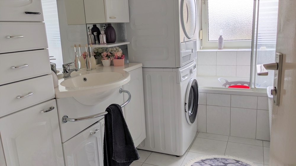 Das angrenzende Badezimmer ist mit Wanne und Waschbecken ausgestattet, hier finden Sie auch den Waschmaschinenanschluss.
