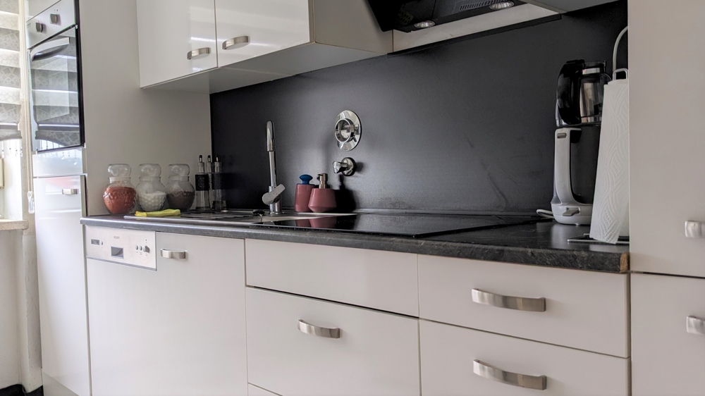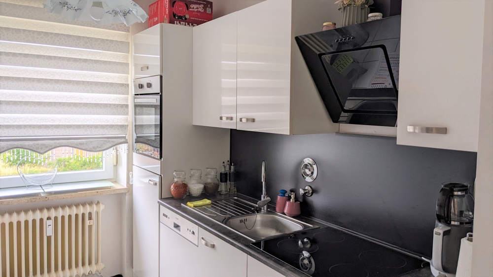 Die helle, freundliche Küche hat ein Fenster.