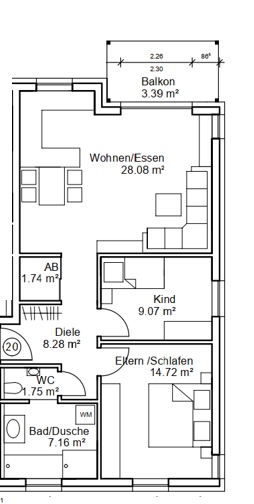 Der großzügige Koch-, Ess- und Wohnbereich bietet Zugang zum Balkon. Neben dem Elternschlafzimmer finden Sie das Kinderzimmer vor. Das Badezimmer ist mit Wanne, Dusche und WC ausgestattet. Ein praktischer Abstellraum bietet zusätzlichen Stauraum.