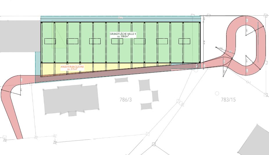 Die Produktions- bzw. Lagerhalle bietet ca. 1.860 m² Nutzfläche. Die Halle wird in Massivbauweise mit Flachdach erstellt. Durchgehende Oberlichten sowie Seitenfenster sorgen für Tageslicht. Eine überdachte Anlieferungszone mit ca. 275 m² Nutzfläche ist angedacht.