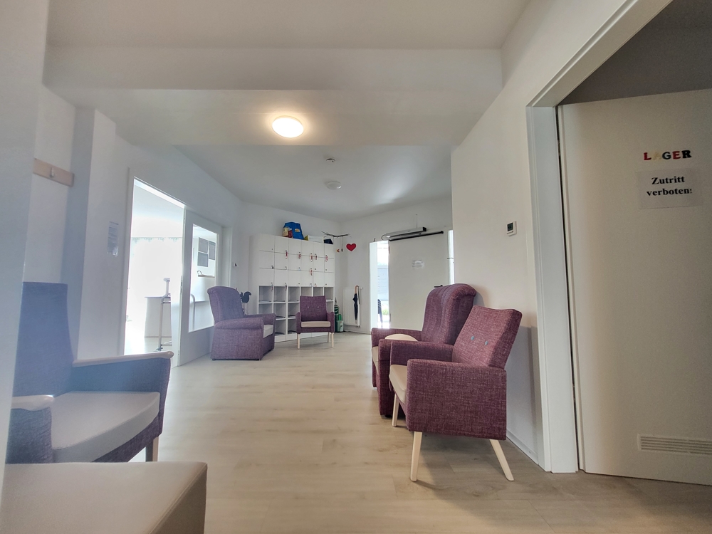 Bodentiefe Fenster durchfluten die Räumlichkeiten mit Tageslicht. Als Bodenbelag wurde strapazierfähiges Vinyl gewählt.