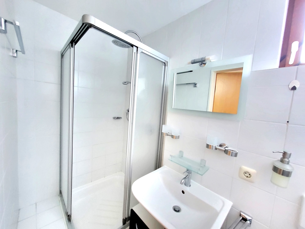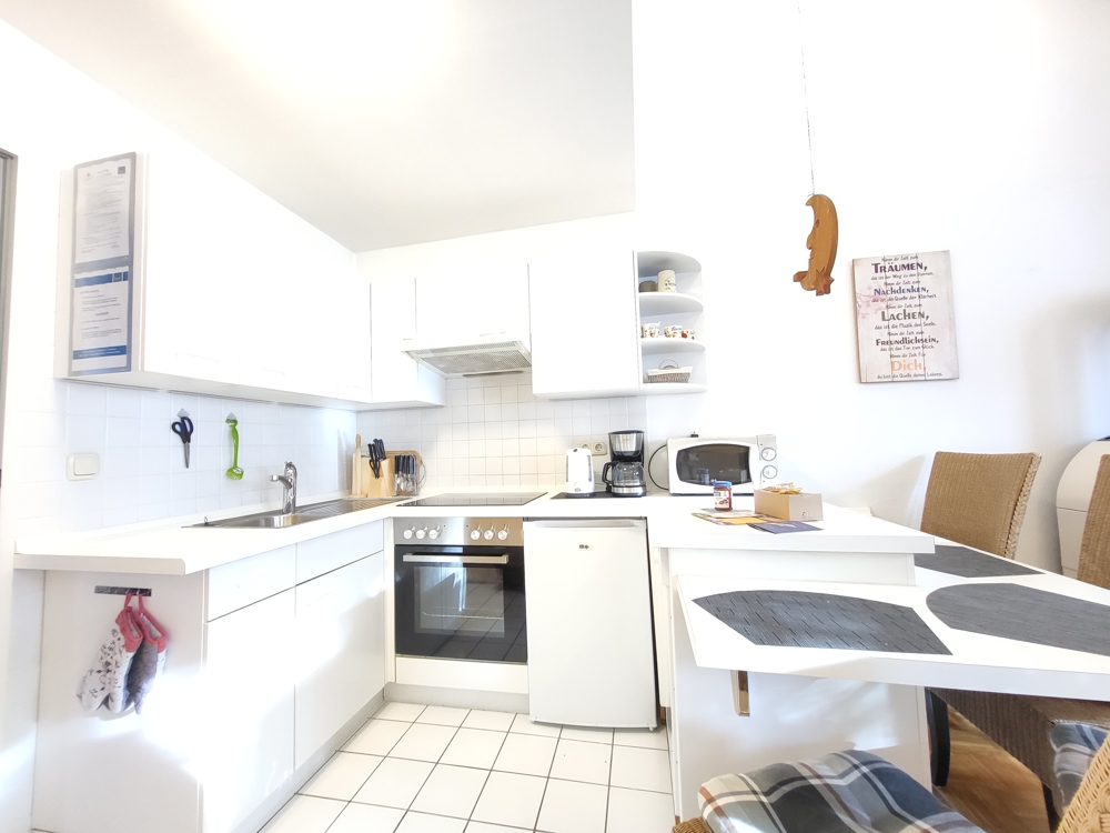 Die gepflegte Ferienwohnung wird über einen Windfang betreten. Vom angrenzenden Flur aus erreichen Sie alle Räume. Highlight ist der nach oben offene, modern eingerichtete Wohnraum mit Kaminofen. Die Küche ist mit allen nötigen Elektrogeräten und Geschirrspüler voll ausgestattet. Ein gemütlicher Essbereich lädt zum Verweilen ein. Das Schlafzimmer ist mit einem Doppelbett und einem Kleiderschrank möbliert. Im Badezimmer verfügen Sie über Dusche, Waschbecken und WC.