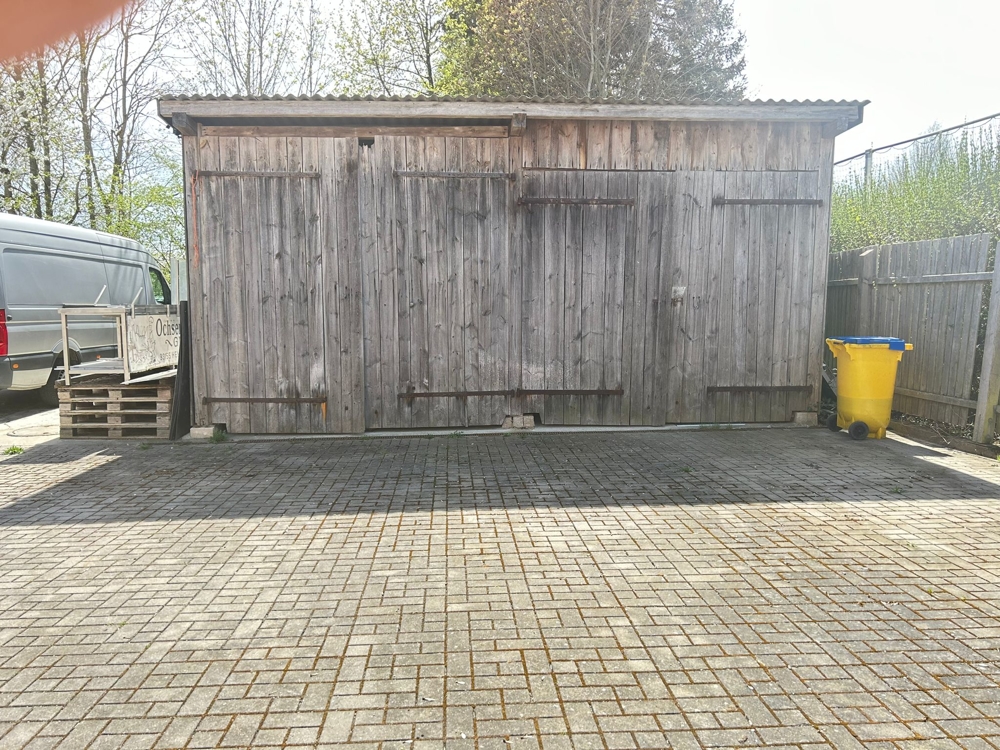 Eine Holzscheune auf dem Gelände kann als weitere Unterstellmöglichkeit genutzt werden.