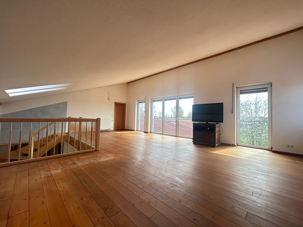 Über eine breite Echtholztreppe gelangt man in das offen gestaltete Galeriegeschoss. Hier finden Sie weitere, ca. 55 m² Wohn-/Nutzfläche. Vor dem Eingang in die privaten Wohnräume gibt es eine geräumige Diele mit Garderobe und einen separaten Raum, der als weiteres Büro oder Gästezimmer genutzt werden kann.