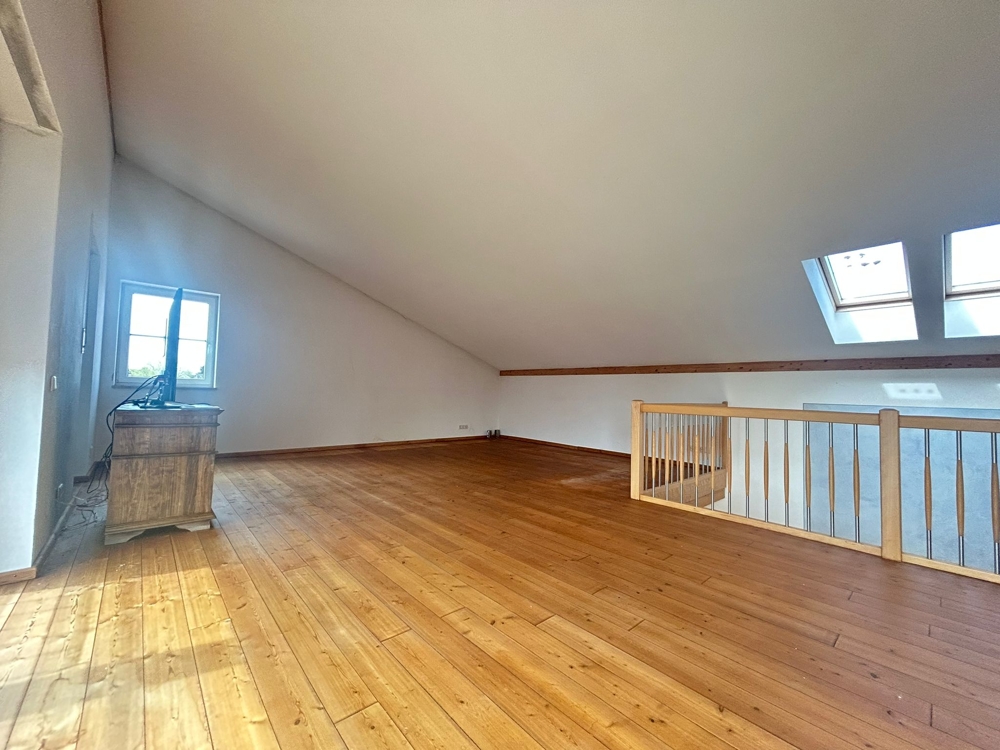 Über eine breite Echtholztreppe gelangt man in das offen gestaltete Galeriegeschoss. Hier finden Sie weitere, ca. 55 m² Wohn-/Nutzfläche. Vor dem Eingang in die privaten Wohnräume gibt es eine geräumige Diele mit Garderobe und einen separaten Raum, der als weiteres Büro oder Gästezimmer genutzt werden kann.