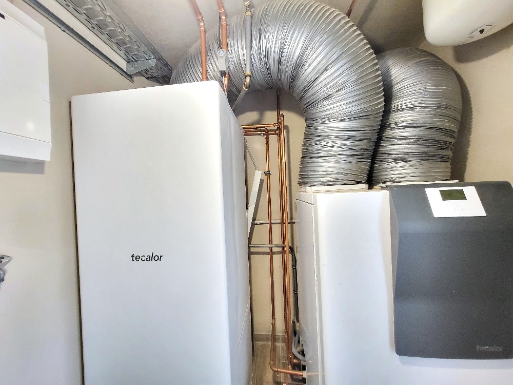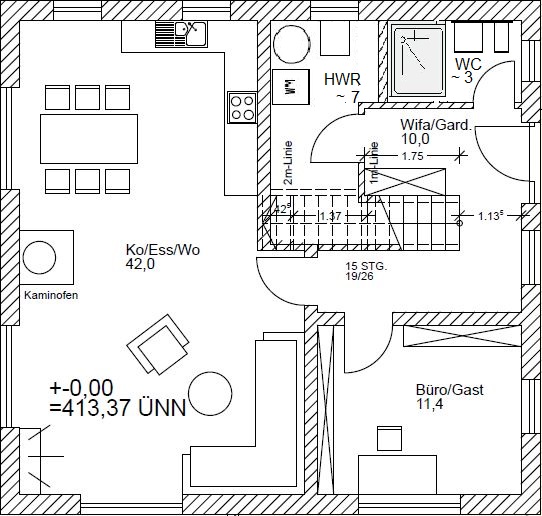 Im Erdgeschoss finden außerdem ein Büro, ein Duschbad, sowie der Haustechnikraum Platz.