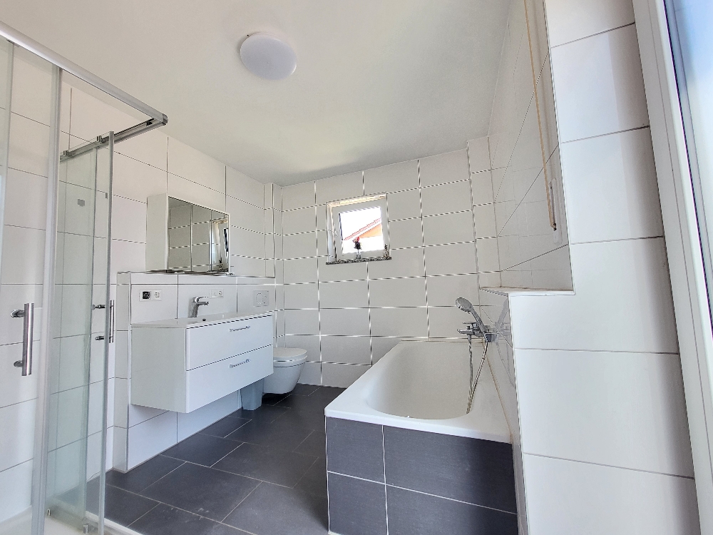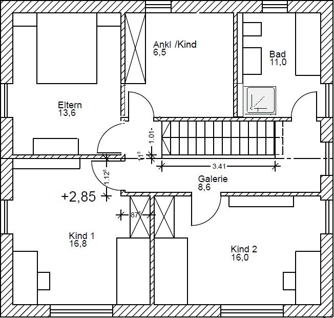 Über eine geradläufige Treppe gelangen Sie in die helle Galerie des Obergeschosses. Vier verschieden große Schlaf- / Kinderzimmer bieten Platz auch für große Familien. Das moderne Bad mit Dusche, Wanne und hochwertigen Sanitärobjekten lässt keine Wünsche offen. Über eine Einschubtreppe gelangen Sie auf den Dachboden.